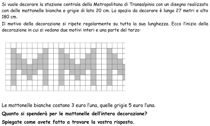 Calcolare il prezzo delle mattonelle di una decorazione, costituita da un motivo che si ripete a forma di “M” contenuto in un quadrato di 9 × 9 mattonelle quadrate di due colori, conoscendo il prezzo delle mattonelle di ciascun colore.