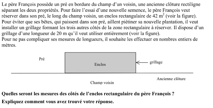 - En conclure que le père François a deux possibilités s’il veut utiliser entièrement ses 20 m de grillage : faire un enclos de 6 m pour le côté parallèle à la clôture sur 7 m pour les deux côtés perpendiculaires ou un enclos très allongé de 14 mètres de long sur 3 m de large.