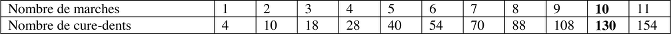 - Dessiner ou construire les « escaliers » de 5 ; 6 ; 7 ; … marches et dénombrer les cure-dents nécessaires : 40 ; 54 ; 70 ; … pour arriver à 130 cure-dents pour l’escalier de 10 marches et constater qu’il faudrait 154 cure-dents pour l’escalier de 11 marches, qu’il ne sera pas possible de construire entièrement.