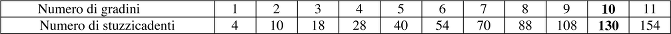 - Disegnare o costruire le " scale" di 5; 6; 7; ... gradini e trovare un metodo che permetta di contare gli stuzzicadenti necessari senza ripetizioni: 40; 54; 70; ... per arrivare a 130 stuzzicadenti per la scala di 10 gradini e constatare che occorrerebbero 154 stuzzicadenti per la scala di 11 gradini, che non sarà possibile costruire interamente.