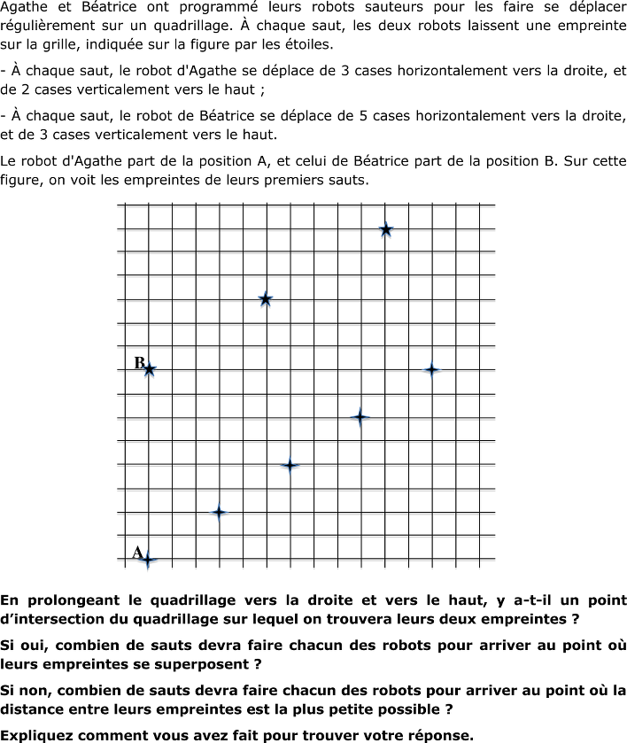 - Prolonger effectivement le quadrillage sur une ou plusieurs feuilles collées ou travailler sur une feuille à carreaux plus petits et construire les traces des deux robots pour arriver au point commun et constater qu’on y arrive après 40 sauts de A et 24 sauts de B.