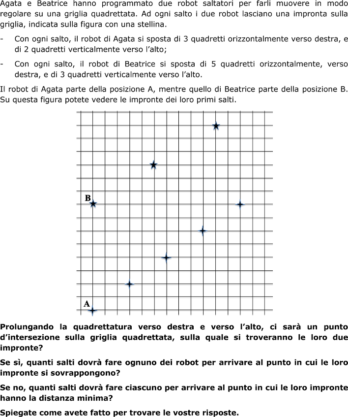 - Osservare le tracce dei robot, prolungare gli spostamenti (mentalmente o per costruzioni effettive) e capire che le tracce si posizionano su due rette e che bisognerà «uscire dal foglio» per trovare il punto di intersezione . Per trovare il punto di intersezione: «Prolungare» materialmente la quadrettatura con un collage, o lavorare su di un foglio a quadretti più piccoli e costruire le tracce dei due robot per arrivare al punto comune, e constatare che si arriva dopo 40 salti di A e 24 salti di B.
