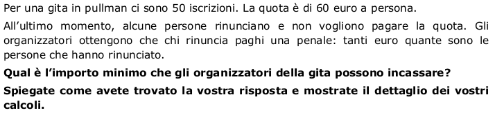 - La parola “minimo” in “Qual è l’importo minimo che gli organizzatori della gita possono incassare?” generale ugualmente incomprensione. Proponiamo di utilizzare la formulazione “Fra tutti i possibili importi che gli organizzatori della gita possono incassare, qual è il minore?”