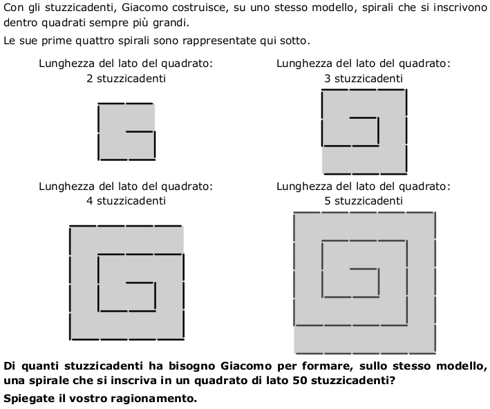 - Riconoscimento della relazione tra il numero di stuzzicadenti del ramo esterno della spirale, del ramo interno della spirale e il numero di stuzzicadenti del lato del quadrato considerandole tre grandezze indipendenti (ni = (ne/4)•(n – 1), con ni = numero stuzzicadenti interni, ne = numero stuzzicadenti esterni, n = numero stuzzicadenti lato del quadrato).