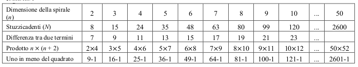 - sia identificando i quadrati dalla dimensione delle spirali aumentate di $1$ ($n – 1$), $9$, $16$, $25$, $36$, $49$ e scoprendo che il numero degli stuzzicadenti vale $1$ in meno di questi quadrati. Questa funzione permette di passare direttamente dalle dimensioni della spirale al numero degli stuzzicadenti $N = (n + 1)^2 – 1$;
