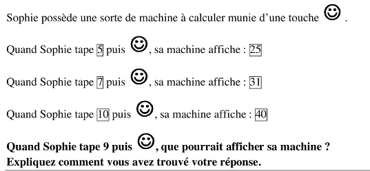 Trouver une fonction valable pour les trois couples objet-image (5 ; 25), (7 ; 31), (10 ; 40), et calculer l’image de 9 par cette fonction (la fonction la plus simple est une fonction affine).