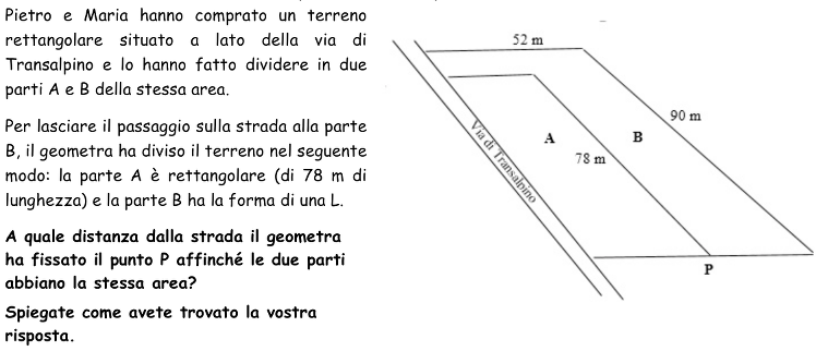 - Constatare che l’area totale si calcola facilmente (è un rettangolo di dimensioni 90 e 52) e che perciò si potrà calcolare l’area di ciascuna delle due parti uguali, perciò di A, che è un rettangolo di cui si conosce la lunghezza e di cui si potrà calcolare la larghezza.
