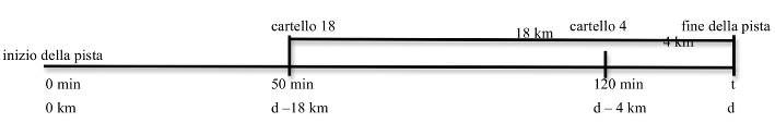 Rappresentarsi la pista dalla partenza all’arrivo con i due cartelli menzionati e far corrispondere ai punti dei cartelli, le distanze indicate, le durate dei percorsi di Alessandra, rendendosi conto che le durate sono espresse dalla partenza e le distanze dalla fine, per arrivare ad uno schema del tipo: