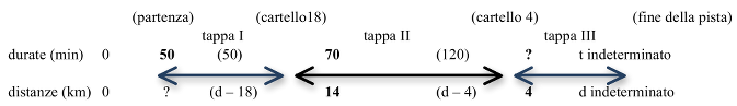 - Rendersi conto che questa prima rappresentazione tratta dalla lettura dell'enunciato non dà né le durate né le distanze corrispondenti alle differenti "tappe" o "parti" del percorso, ma che se ne possono calcolare alcune tra cui in particolare 70 = 120 - 50 in minuti per la tappa II e 14 = 18 - 4 in km per la lunghezza di questa tappa.