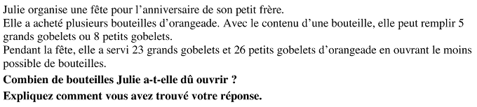 Ou bien utiliser une procédure qui fait intervenir des nombres non entiers. Exprimer le volume de chaque gobelet par rapport à celui d'une bouteille : 1/5 et 1/8 ou 0,2 et 0,25 en nombres décimaux. En déduire que le volume de l’orangeade versée en tout dans les gobelets est 23 × 0,2 + 26 × 0,125 = 4,6 + 3,25 = 7,85. Conclure que Julie a dû ouvrir 8 bouteilles.