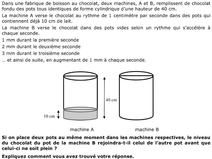 - Conclure qu’en 30 secondes le niveau de chocolat du pot de la machine B dépasserait le niveau de celui de la machine A et que, par conséquent, il rejoindrait le niveau du pot A avant que celui-ci ne soit plein.
