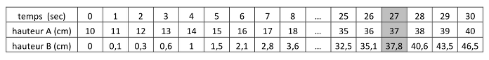 - Observer qu'à la 30ème seconde, lorsque le pot A est plein, le pot B est certainement plein car la hauteur du liquide serait de 46,5 cm