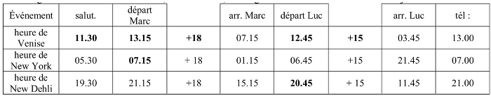 - Comprendre qu’au moment de l’arrivée à destination les deux amis ne peuvent pas se téléphoner parce que Marc arrive à 1:15 de nuit et qu’il faut attendre 7h du matin lorsqu’il se réveillera. 7 h de NY correspondent à 13h de Venise et à 21 h de ND, et on constate que personne ne dort à ce moment.