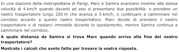 Oppure: Il nastro avanza a 5 km/h cioè 5000 m in 60 minuti, quindi per fare 1000 m occorrono 12 min e per 250 m occorrono 12/4, cioè 3 min. Samira che cammina a 4 km/h, cioè 4000 m in 60 minuti, durante 3 minuti, cioè 20 volte meno, farà 4000/20 = 200 m.