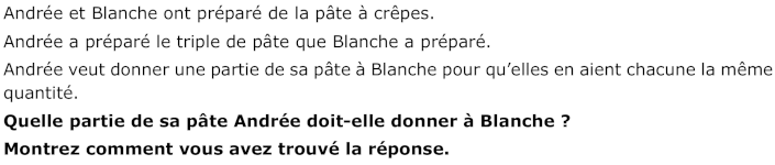 - L’appropriation du partage en deux parties égales doit tenir compte des deux seules données de l’énoncé : une « préparation » de pâte pour Blanche et trois « préparations de B» pour Andrée. La grande vaut alors 3 unités, ensemble il y a quatre unités. (L’unité est la « préparation » de pâte de Blanche, implicite ou non) Les élèves peuvent se représenter mentalement les « préparations » par des volumes (une boule par exemple) , des masses (1 kg par exemple), des récipients (1 plat) … par des objets ou par un dessin.