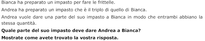 - Poiché conosciamo solo il rapporto tra le due preparazioni, dobbiamo prendere come unità una delle due, preferibilmente quella piccola per avere due numeri interi. Quella grande vale quindi 4 unità, insieme ci sono 5 unità. Andrea deve quindi dare una e mezza delle sue quattro unità a Bianca affinché ciascuna di loro abbia la stessa quantità (2,5 unità).