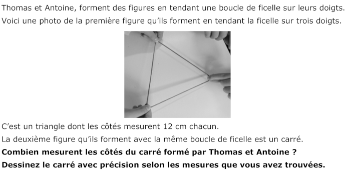 - Comprendre qu’il est possible de former de nombreuses figures avec une même boucle tendue sur une feuille et que toutes ces figures auront le même périmètre.