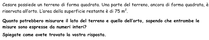 - Prendere in conto la formula dell’area del quadrato e l’esigenza di misure intere dei lati per restringere il problema nell’insieme dei numeri naturali alla ricerca di due numeri quadrati la cui differenza sia 75.
