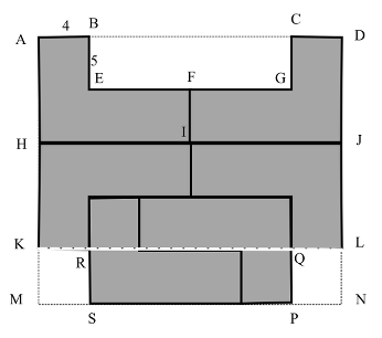 - Per determinare l’area della parte del rettangolo non ricoperta dai sei pezzi, considerare che essa è la somma delle aree del rettangolo BCGE e dei due rettangoli bianchi KMSR e LNPQ: dopo aver trovato le lunghezze, ciò porta ad ottenere (5 x 16 + 2 x 5 x 4) cm2, cioè 120 cm2.