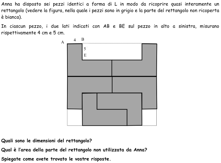 Di un rettangolo sul quale sono disposti 6 pezzi identici a forma di L, dei quali sono note due dimensioni, determinare le dimensioni e l’area della parte non ricoperta.