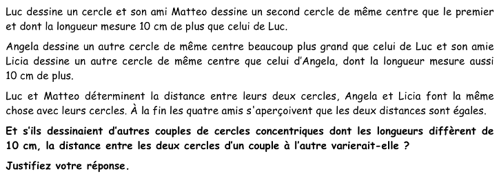 Montrer que dans des couples de cercles concentriques dont les longueurs diffèrent d'une même mesure, la distance entre les deux cercles est constante.