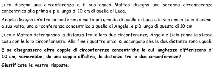- Constatare che il risultato è generale: indicare rispettivamente con c e C, le misure delle lunghezze delle circonferenze interna ed esterna e con r e R le misure dei loro raggi e ottenere: C = 2πr +10, R = (2π r + 10) / (2π), R– r = 5/π.