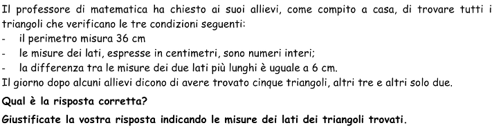- Immaginare le dimensioni di alcuni triangoli soddisfacenti alle tre condizioni. Rendersi conto che, dal punto di vista numerico, si tratta di trovare tre numeri naturali la cui somma è 36 e per i quali la differenza tra i due maggiori è 6.