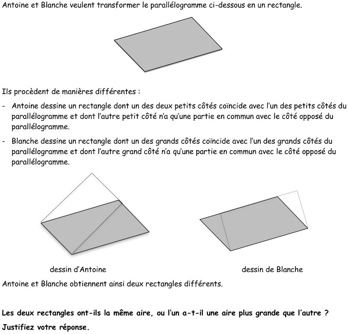 Exemple: - Les deux rectangles ont la même aire car on a découpé les deux rectangles en pointillés puis les avons superposés et découpé et nous avons remarqué qu’ils avaient la même aire ...
