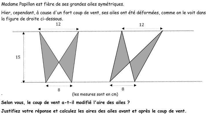2) du genre algébrique, pour le calcul de l’aire d’une aile : Remarquer que les ailes de Madame Papillon sont inscrites dans deux trapèzes de bases 12 cm et 8 cm et de hauteur 15 cm et donc de même aire (A = (12+8)×15/2 = 150 cm2). Quelle que soit la figure considérée, on note a l’aire d’une des deux ailes, h la hauteur du petit triangle blanc, H celle du grand triangle blanc, et A l’aire du trapèze. Pour les deux figures, on a les relations : H + h = 15 ; A = 2a + 4h + 6H et a = 4×15 – 4h. On en déduit l’équation en h : 8×15 – 8h + 4h + 6(15 – h) = 150, d’où h = 6. Pour les deux figures, l’aire d’une aile est donc égale à 4×15 – 4×6 = 36 cm2. Le coup de vent n'a pas changé les aires des ailes.