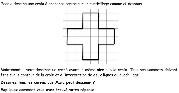 - Comprendre qu’il faut construire un carré joignant quatre points du pourtour de la croix, dont l’aire doit être égale à celle de la croix.