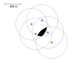 - Colorier la partie du territoire qui est à l’intérieur de tous ces cercles. Cela donne le dessin: