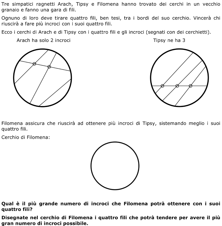 - 4 punti: Risposta corretta (6 incroci) con un disegno dei quattro fili (tratti che si avvicinano più o meno a dei segmenti di retta) che mettono chiaramente in evidenza i 6 incroci (si accettano evidentemente gli incroci posizionati sul cerchio)