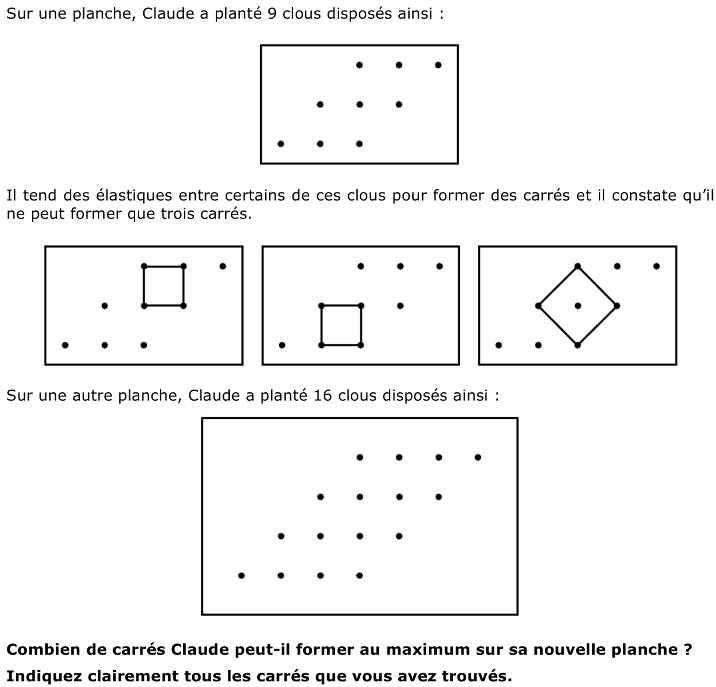 - Comprendre les contraintes du problème : les figures doivent être des carrés dont les sommets sont des clous du support.