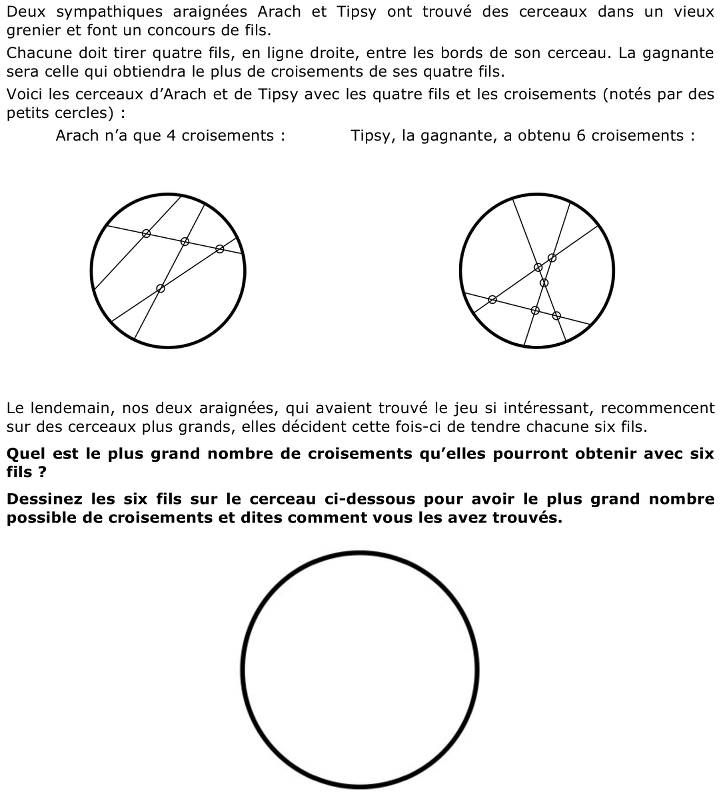 - Vérifier tout d’abord que les quatre fils de Tipsy ont 6 intersections et se convaincre qu’il s’agit du maximum afin de poursuivre la recherche avec cinq et six fils.