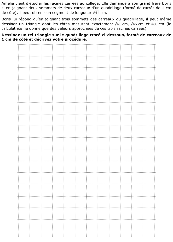 - Réaliser que √41, √45 et √68 ne sont pas des nombres entiers et que les côtés du triangle ne peuvent donc être ni horizontaux ni verticaux, puisqu’ils sont dessinés sur un quadrillage à mailles carrées.