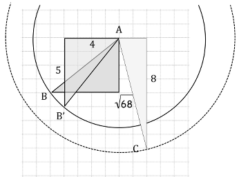 Ou encore, par exemple, dessiner un cercle centré en un point A du quadrillage (fig. 2) de rayon 6,4 cm (√41≈6,403) et constater qu'il y a 8 points possibles sur le quadrillage (deux sur l'illustration) qui pourraient correspondre au segment cherché et le vérifier en appliquant le théorème de Pythagore aux triangles ABD' et AB'C' obtenus.