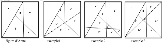 - On donne ici un exemple par désignation des régions de la figure d’Anne et trois exemples avec des dispositions différentes du quatrième segment :