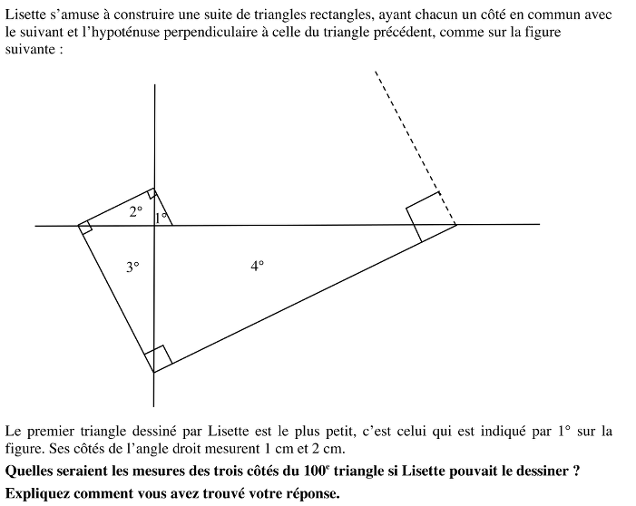 Observer la construction d'une spirale constituées de triangles rectangles et trouver les dimensions du 100e triangles. Les côtés de l'angle droit du premier triangle mesurent 1 et 2 cm.