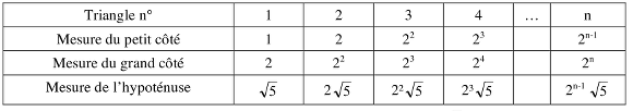 - Remarquer la régularité des mesures des côtés de l’angle droit (et éventuellement de l’hypoténuse) du nième triangle : 2n-1 , 22, construire un tableau :