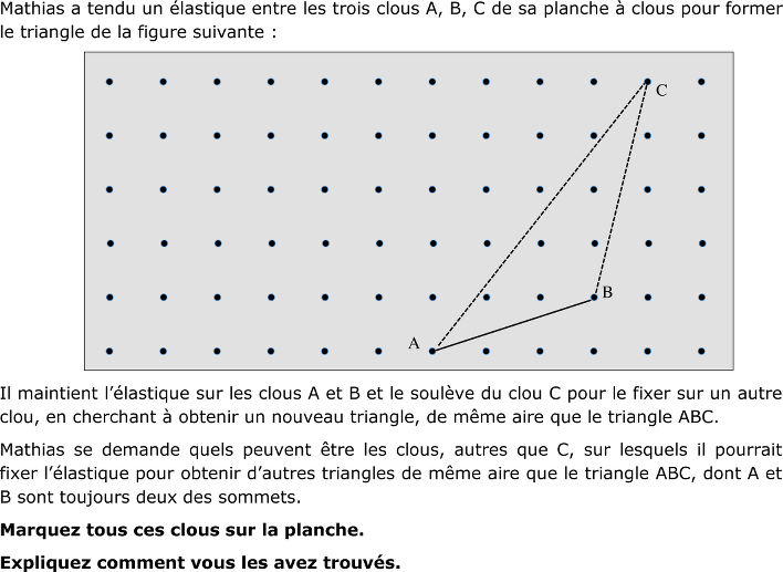 - Observer la figure et comprendre qu’il faudra tenir compte des limites de la planche à clous, de la disposition des clous sur la planche et de l’élastique tendu entre trois clous, de la position de deux des sommets qui est contrainte et de l’aire qui doit rester la même.