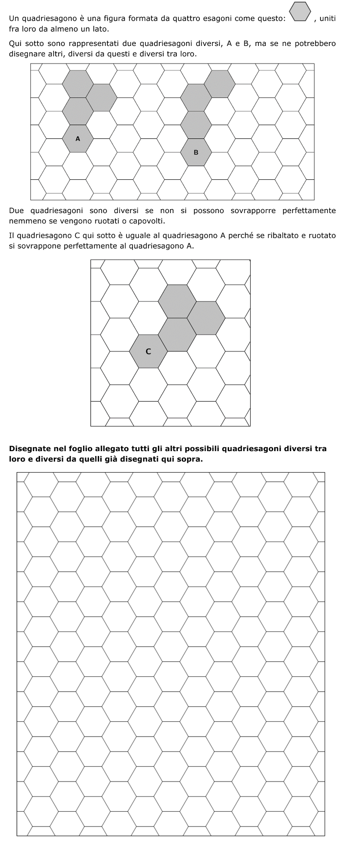 - Comprendere che ogni quadriesagono è una figura composta da quattro esagoni uniti fra loro e che tale unione sul foglio fornito può avvenire solo attraverso i lati e non attraverso i vertici o parti di lato.