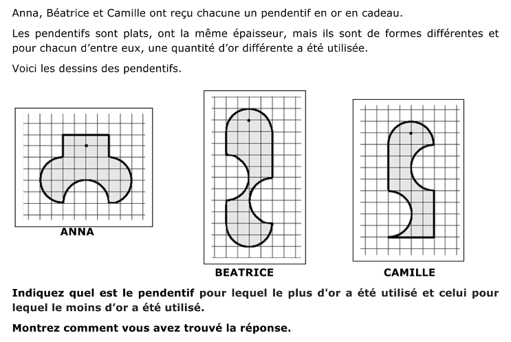 - Décomposer chaque figure, « découper » et recoller les morceaux et se rendre compte que le pendentif d'Anna a une aire égale à celle d’un rectangle de 6 × 4 = 24 c plus celle d’un demi-disque, le pendentif de Béatrice a une aire égale à celle d’un rectangle de 8 × 4 = 32 c et le pendentif de Camille a une aire égale à celle d’un rectangle 4 × 2 = 8 plus celle d’un carré 4 × 4 = 16 donc de 24 carrés, plus celle de la partie dépassant du demi-disque inscrit dans un rectangle 4 × 2. Il est immédiatement évident que le pendentif de Béatrice est celui qui a la plus grande aire, il reste alors à déterminer de manière approximative celui qui a une plus petite aire entre le pendentif d'Anna et celui de Camille. L’aire du demi-disque est plus grande que l’aire de la partie excédentaire, donc le pendentif de Camille est celui qui a la plus petite aire.
