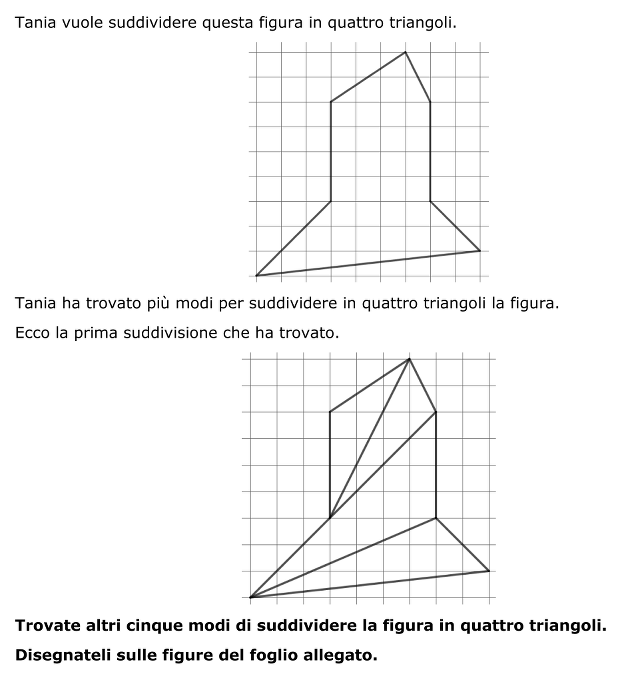 Dato un ettagono concavo disegnato su una griglia quadrettata, trovare cinque diverse scomposizioni in quattro triangoli.
