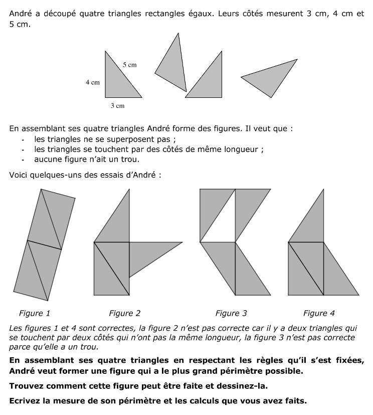 Rechercher, parmi les polygones obtenus en assemblant par des côtés de même longueur quatre triangles rectangles égaux (dont les côtés mesurent 3 ; 4 et 5 cm), l’un de ceux dont le périmètre est maximal.