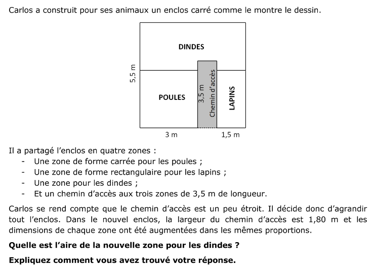 - Considérer l’aire de la zone réservée aux dindes comme étant la différence entre l’aire de l’enclos et de la somme des 3 autres zones qui sont un carré et deux rectangles. Déterminer la largeur initiale du chemin d’accès, les autres dimensions étant connues. Calculer les dimensions de l’enclos et de ces zones agrandies (9,9 m x 9,9 m ; 5,4 m x 5,4 m ; 1,8 m x 6,3 m ; 2,7 m x 5,4 m) puis leurs aires (98,01 m2 ; 29,16 m2 ; 11,34 m2 ; 14,58 m2). En déduire l’aire de la zone réservée aux dindes 42,93 m2 [98,01 m2 - (29,16 m2 + 11,34 m2 + 14,58 m2)].