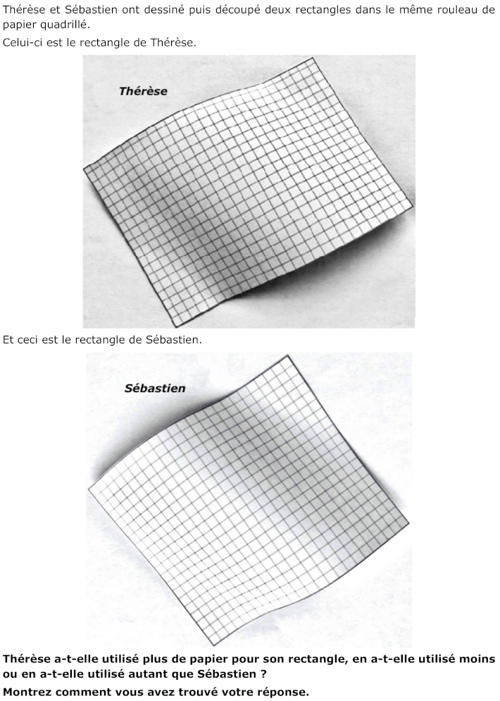 Comprendre la situation : les deux rectangles ont été découpés dans le même rouleau donc ils ont le même quadrillage, il faut établir lequel des deux rectangles a la plus grande surface, à savoir celui qui contient le plus grand nombre de carrés.