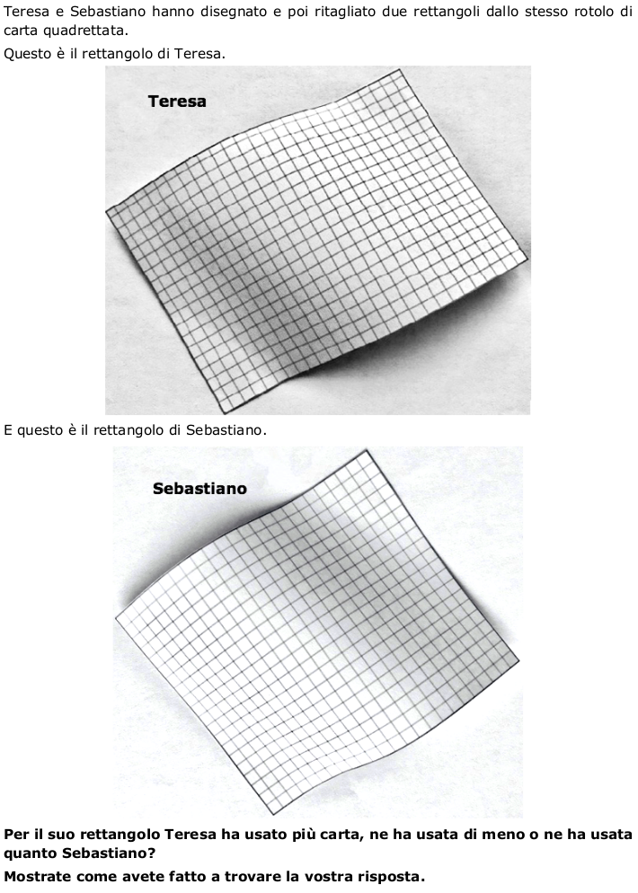 - Ipotizzare che ogni parte sia circa un terzo di un quadretto intero quindi in tutto più di 14 quadretti; in questo caso nel rettangolo di Teresa ci sarebbero più di $482$ ($468 + 14$) quadretti. Anche con questa ipotesi Teresa ha utilizzato più carta. Anche una diversa ipotesi sul conteggio dei quadretti non interi (per esempio che siano diversi quelli della riga inferiore e della colonna di destra) dovrebbe portare alla stessa conclusione.