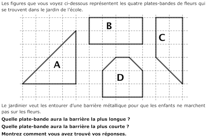 Ou, pour chaque figure, suivre le pourtour avec une ficelle ou une bande ou autre matériel (en mettant éventuellement des marques d’un côté à l’autre). Puis comparer les longueurs des ficelles et noter que la plus longue est celle de A et la plus courte celle de D.