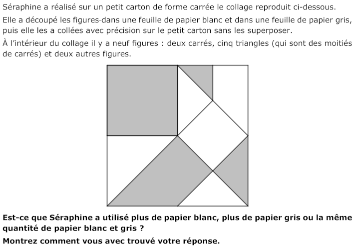 - Se rendre compte alors que la moitié gauche du collage est grise et que la moitié droite n’est pas toute blanche. Il y a un petit triangle gris dans la partie supérieure. Déduire que les figures grises occupent une surface plus grande que les figures blanches.