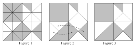 Ou : Partager le grand trapèze en deux triangles (un grand et un moyen) et le grand triangle blanc à gauche en deux triangles moyens qui peuvent être échangés contre les deux triangles gris à droite (voir figure 2).